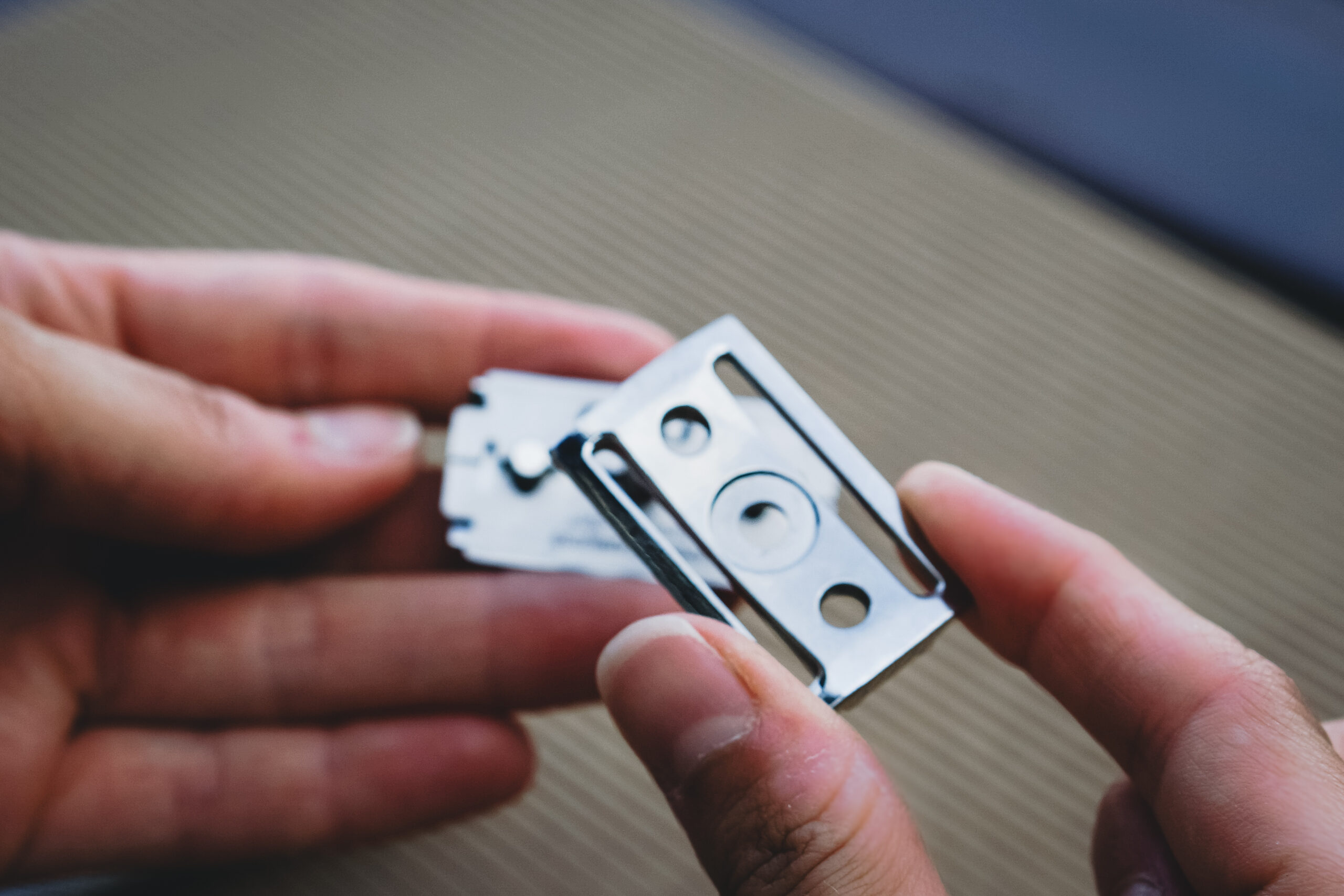 Wenn der Rasierhobel fertig zusammengesetzt ist, steht die Klinge auf beiden langen Seiten minimal über – so, dass man sich rasieren kann.